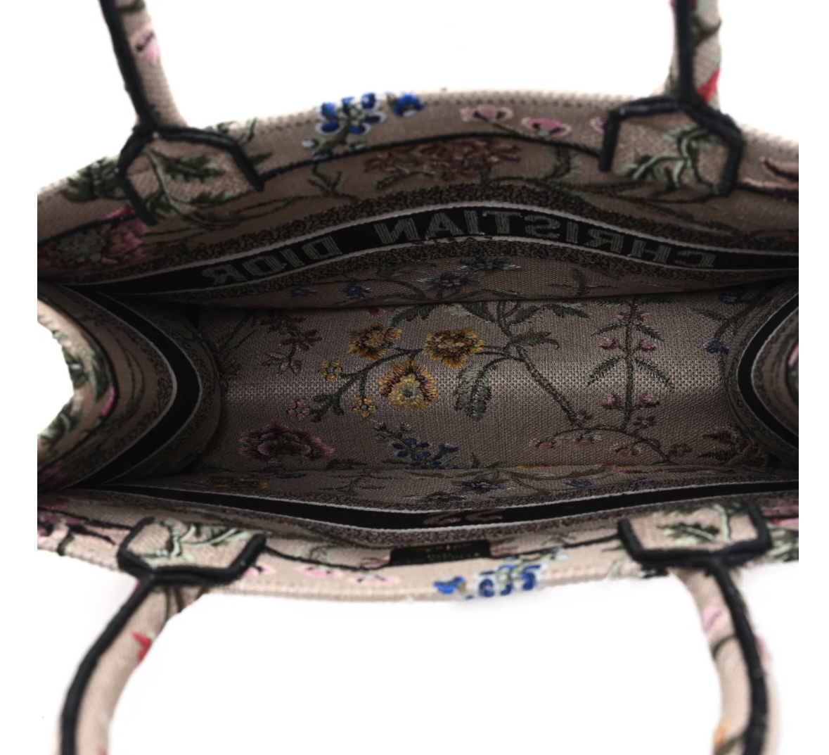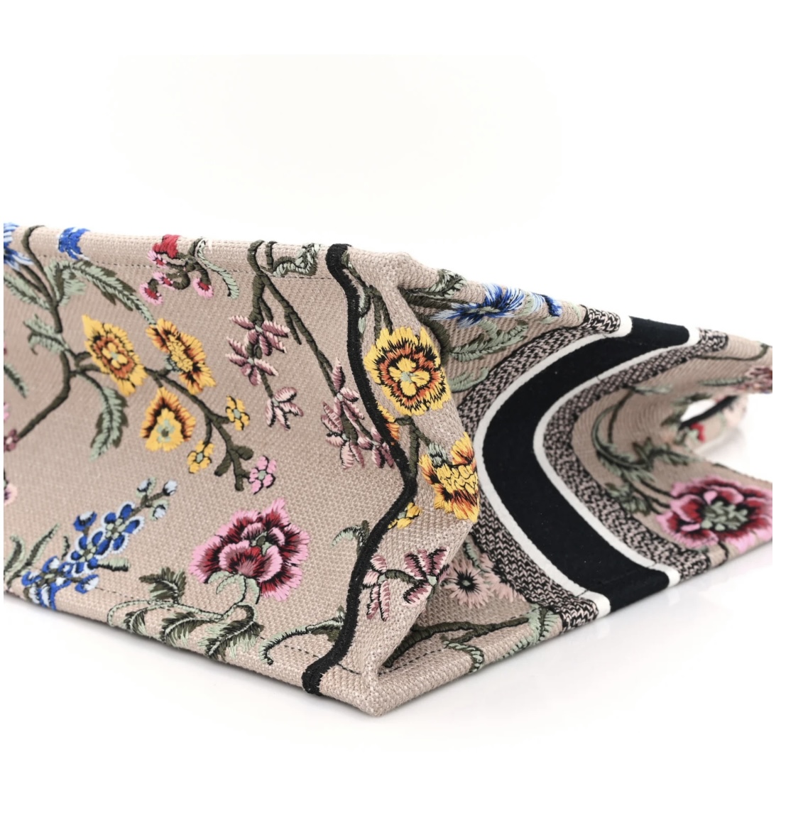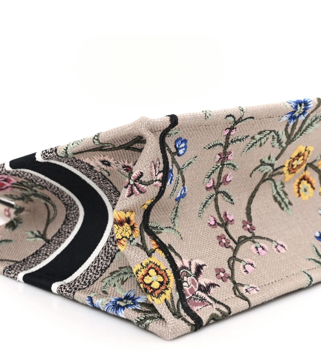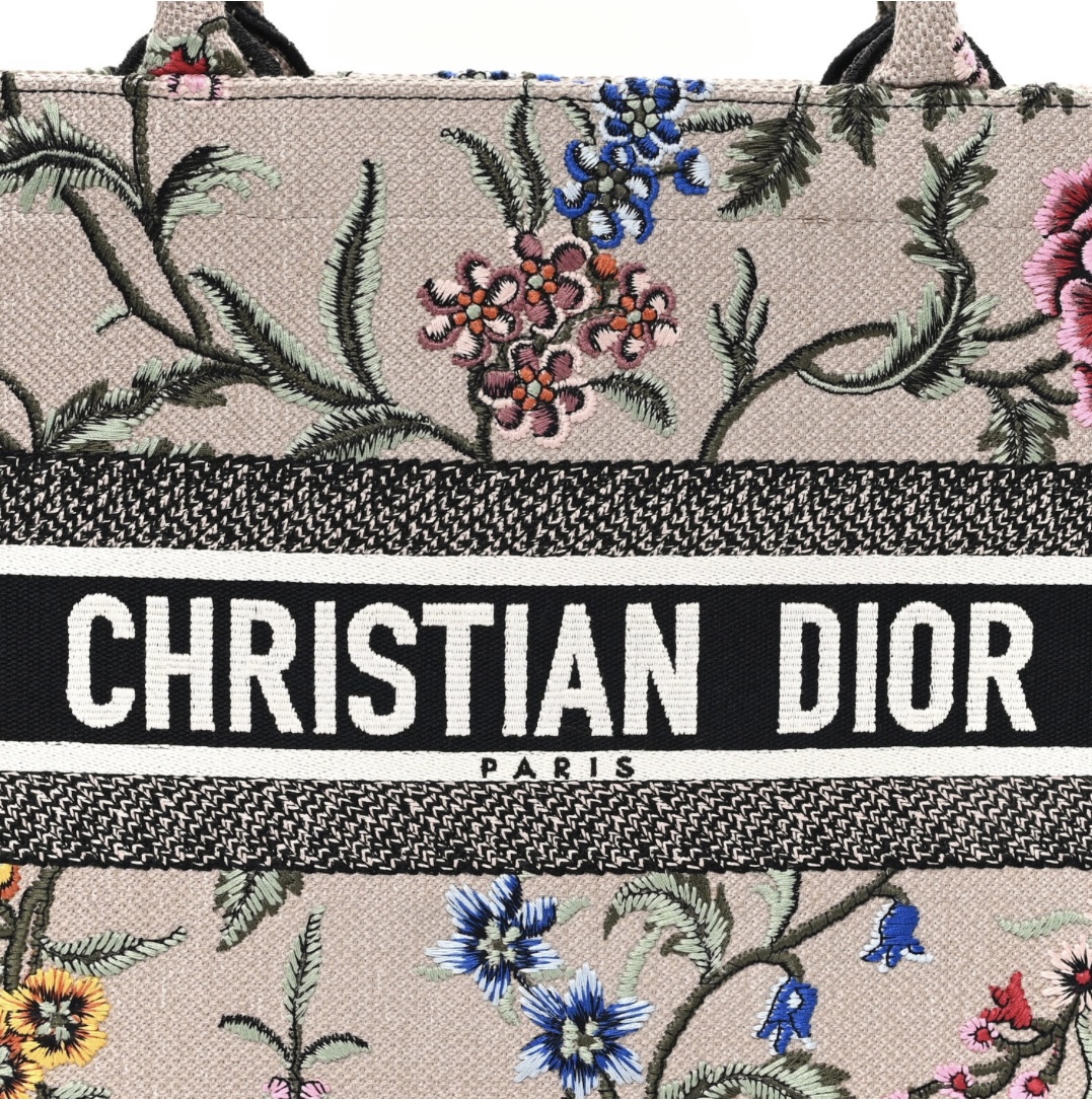 • Material: Premium rose multicolor embroidered canvas, intricate Petites Fleurs floral embroidery, iconic woven signature trim