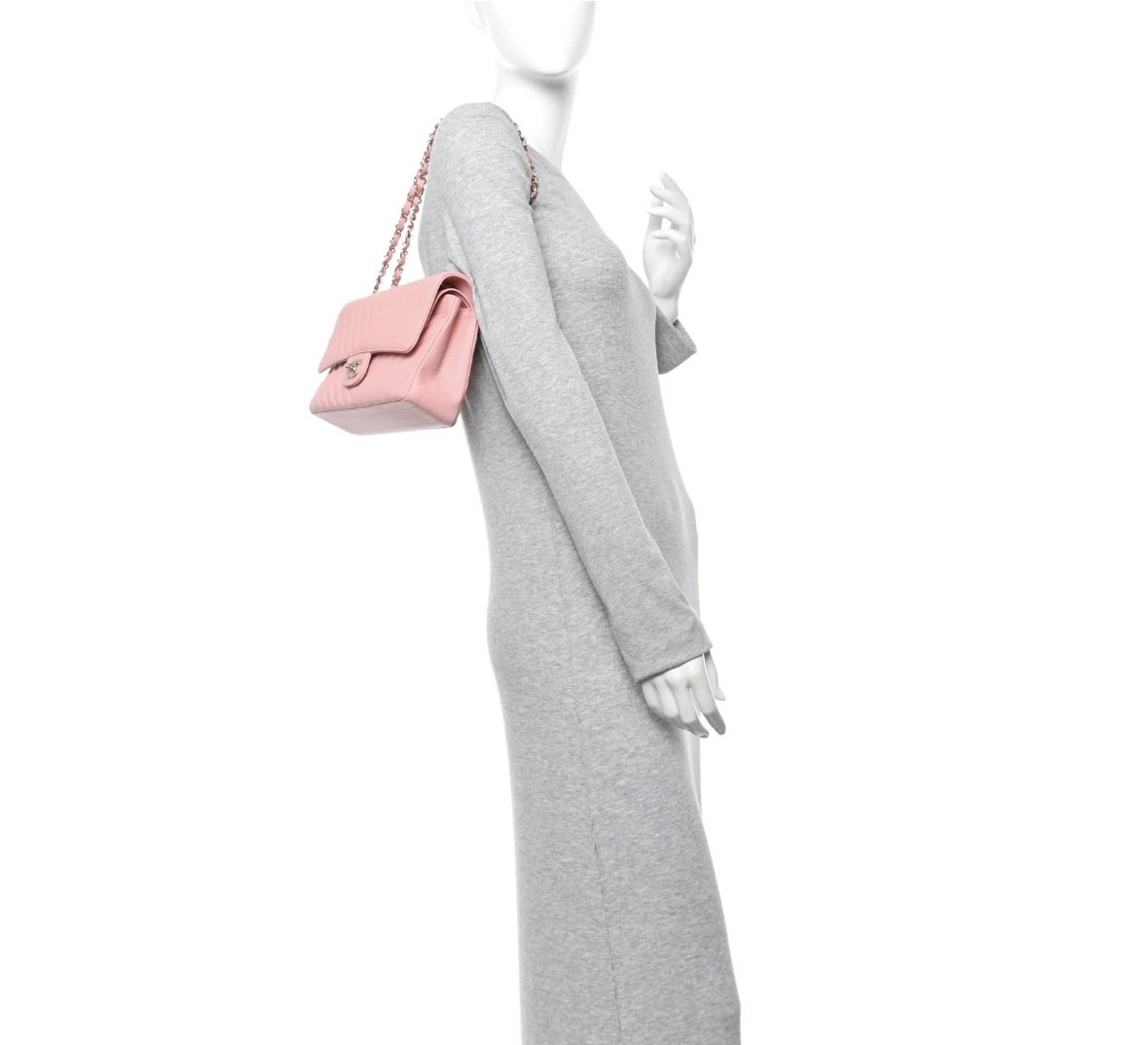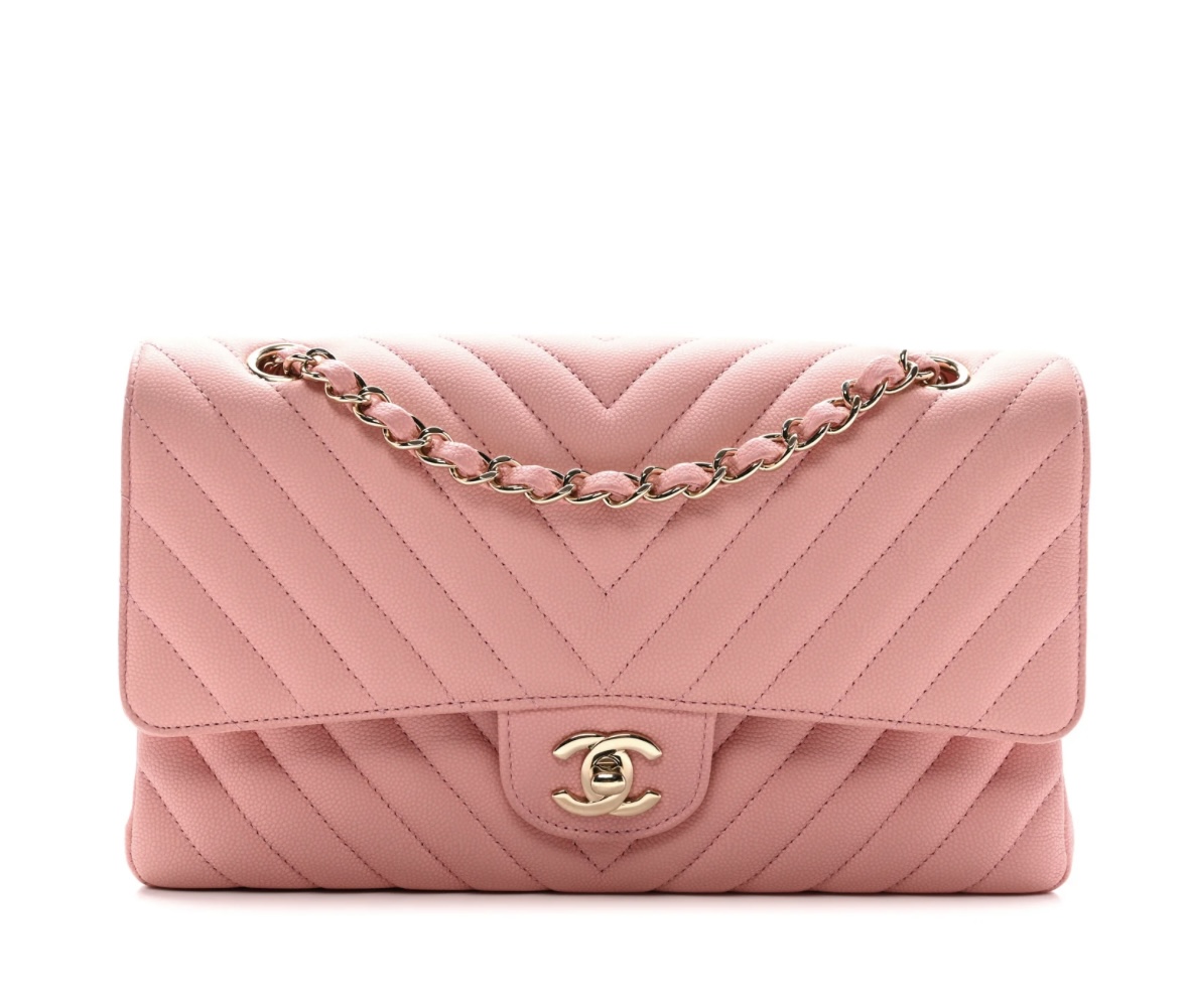 Soft and feminine, the pink caviar leather with chevron quilting adds a delicate, romantic touch to any outfit. Perfect for shoulder or crossbody wear, ideal for brunch dates, special occasions or everyday chic style.