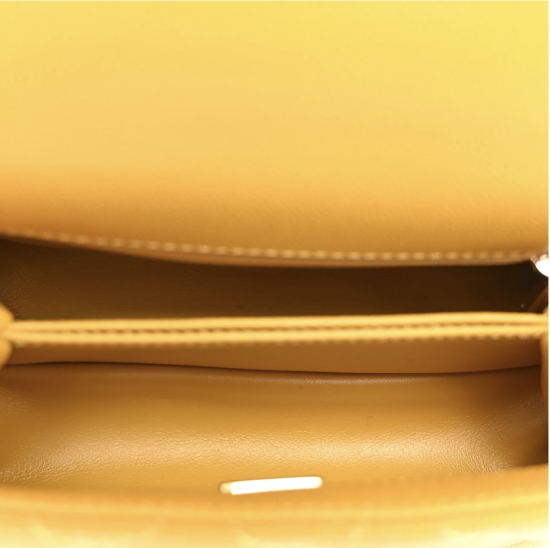 Cheerful and vibrant, the yellow caviar leather offers durable luxury with a sunny, warm hue to elevate any outfit. Perfect for hand carry, shoulder or crossbody wear, ideal for brunch, vacations, parties or everyday sophisticated style.