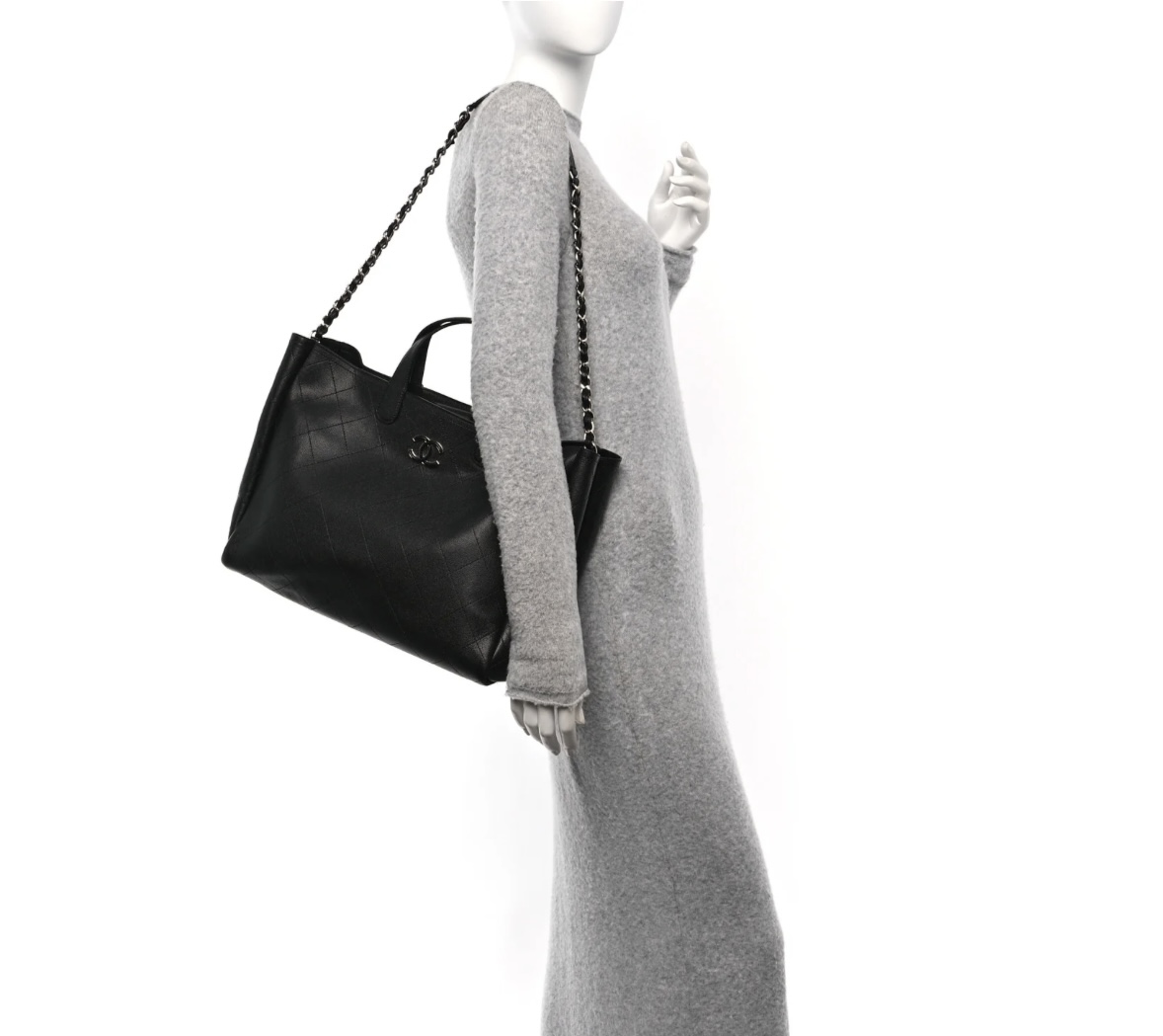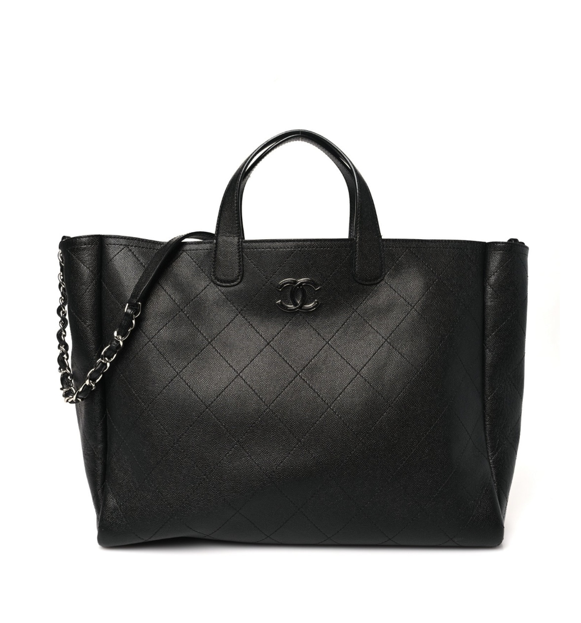 • Features: Open-top tote design, dual patent leather top handles, detachable chain shoulder strap with leather pad, interlocking CC logo, interior zip pocket