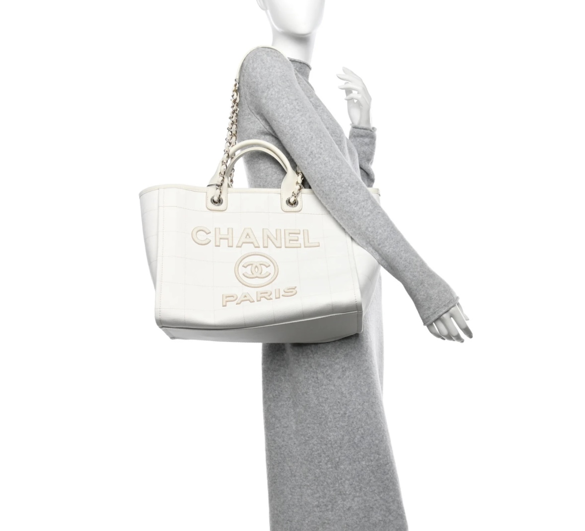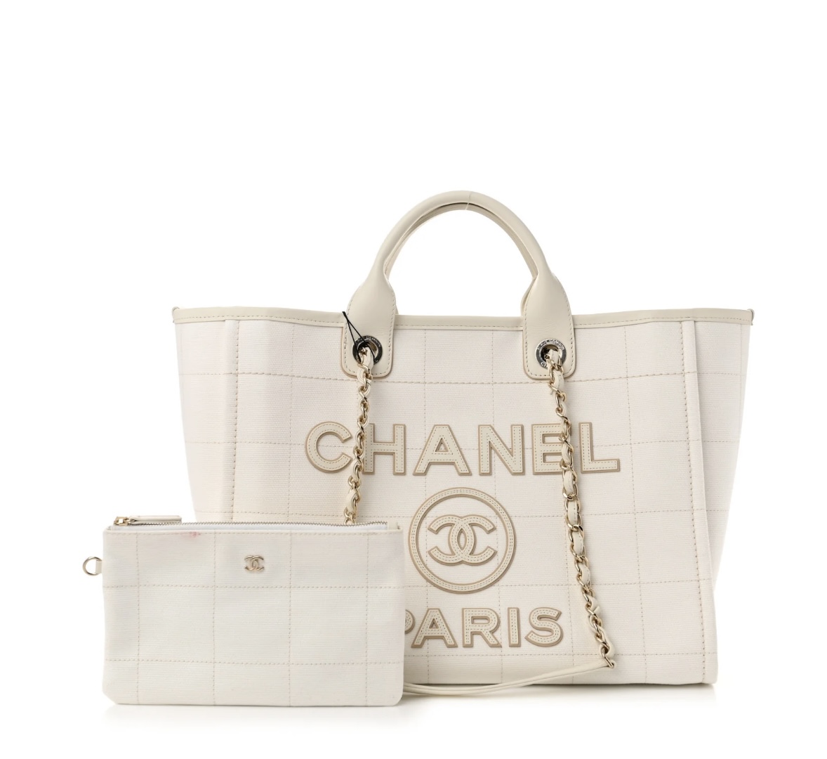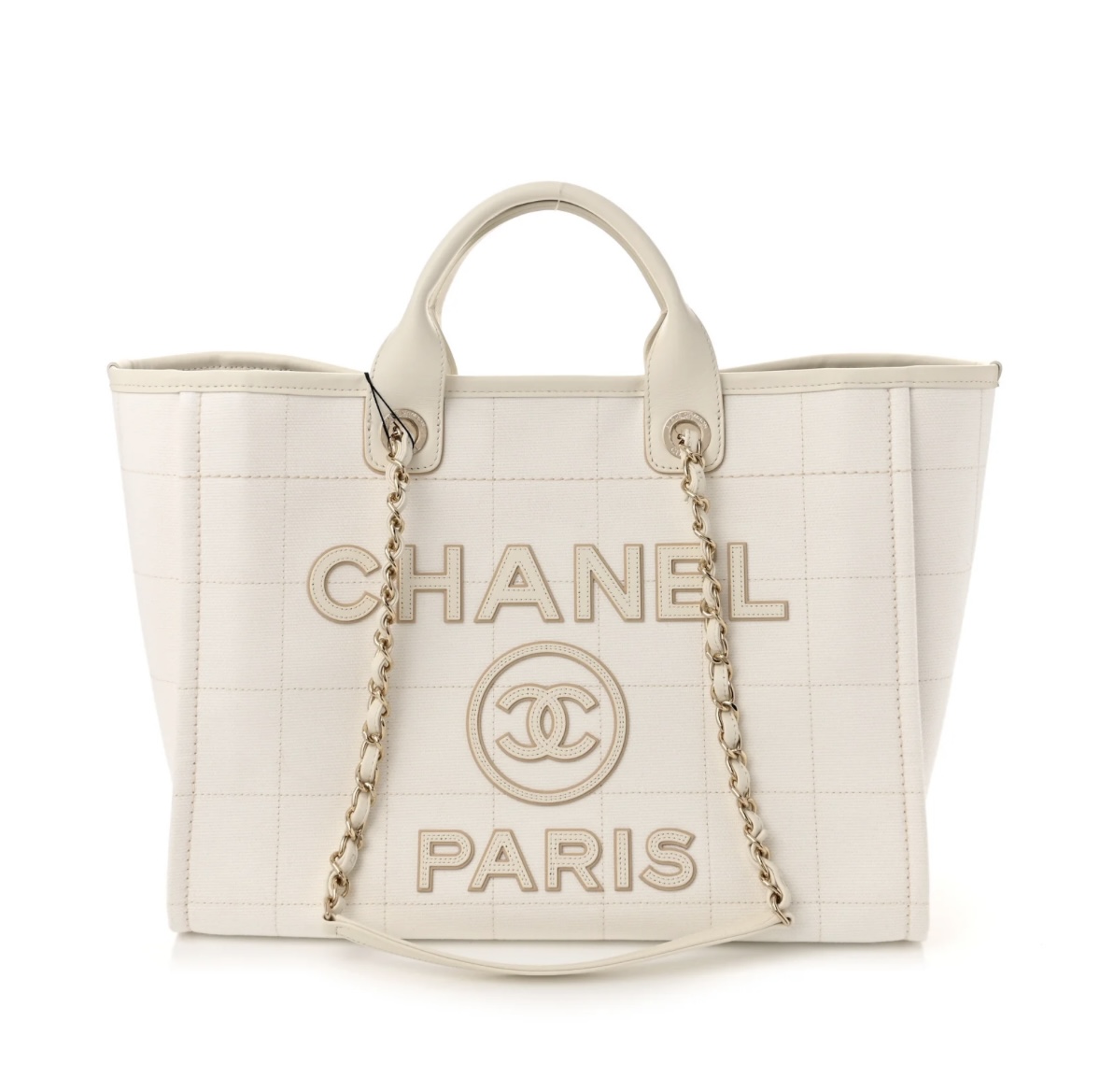 • Features: Open-top tote design, dual leather top handles, detachable chain shoulder strap with leather pad, embossed “CHANEL PARIS” logo, interior slip pocket