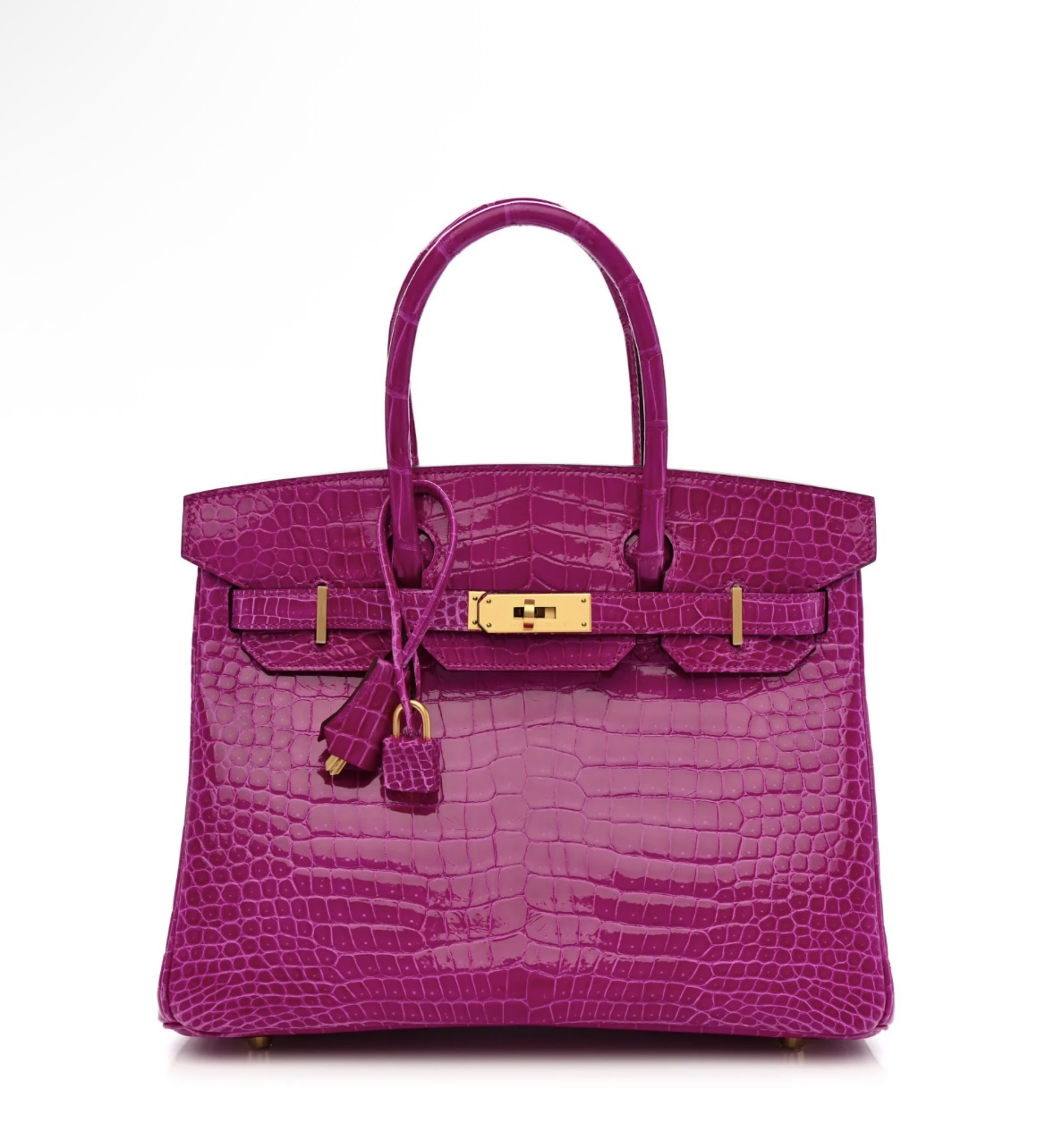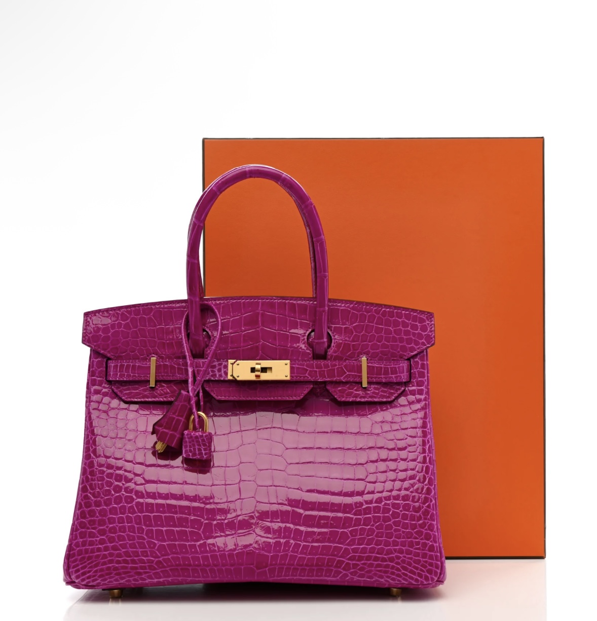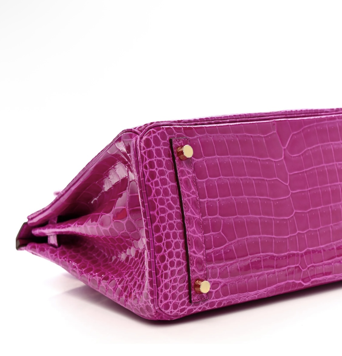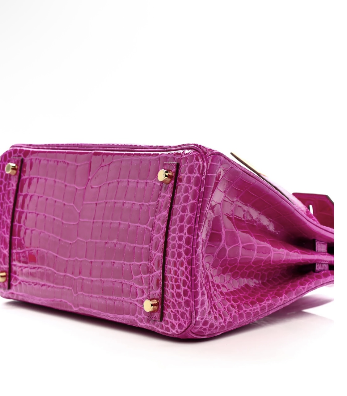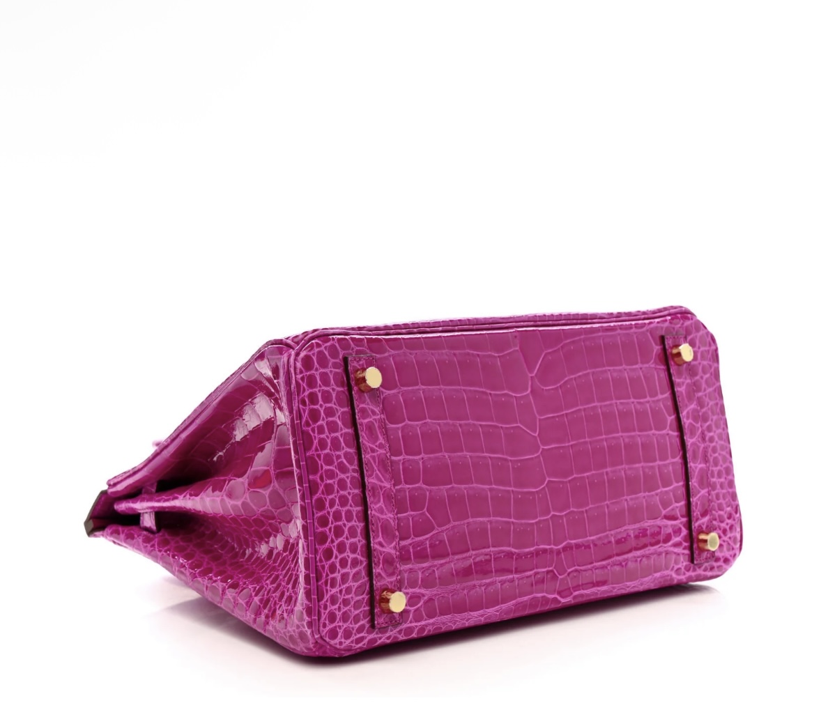 • Material: Premium shiny Porosus crocodile leather (full bag, signature fine symmetrical scale pattern, ultra-glossy finish, durable & luxurious), protective base studs, polished gold-tone metal hardware