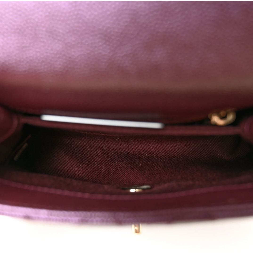 • Material: Premium iridescent purple caviar leather, genuine leather trim, light gold-toned hardware