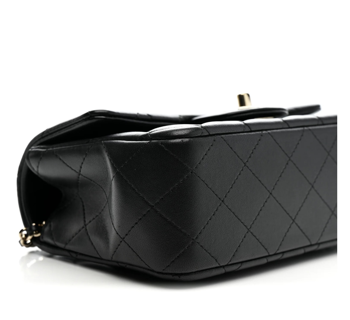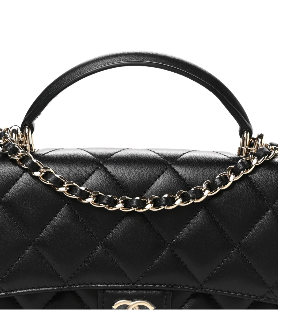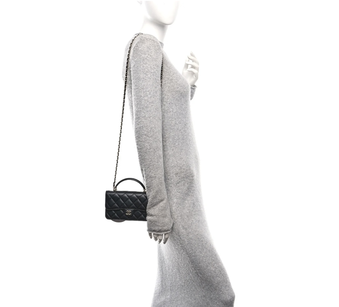 • Features: Classic diamond quilting, detachable leather-chain shoulder strap, top handle, CC turn-lock closure, phone-sized main compartment, interior slot pocket