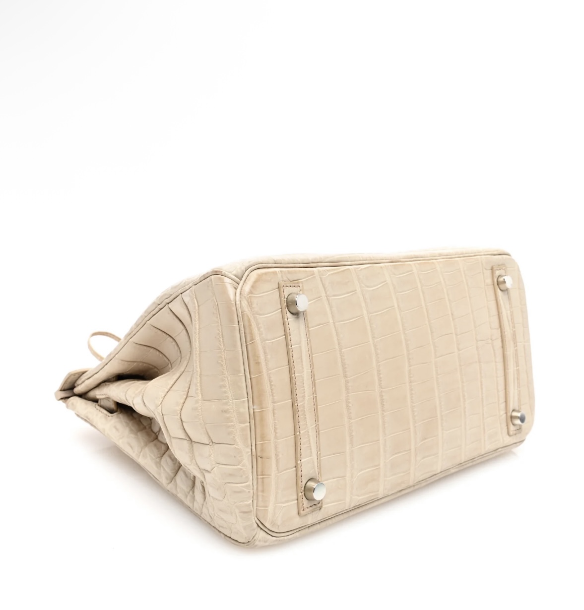• Material: Premium matte Niloticus crocodile leather with natural scale texture, matching rolled top handles, protective base studs, polished palladium-tone metal hardware