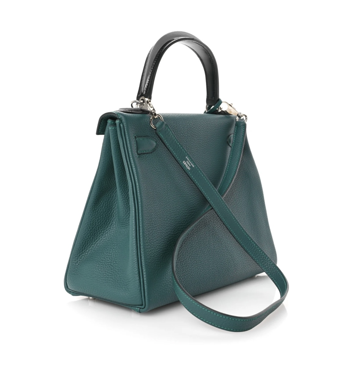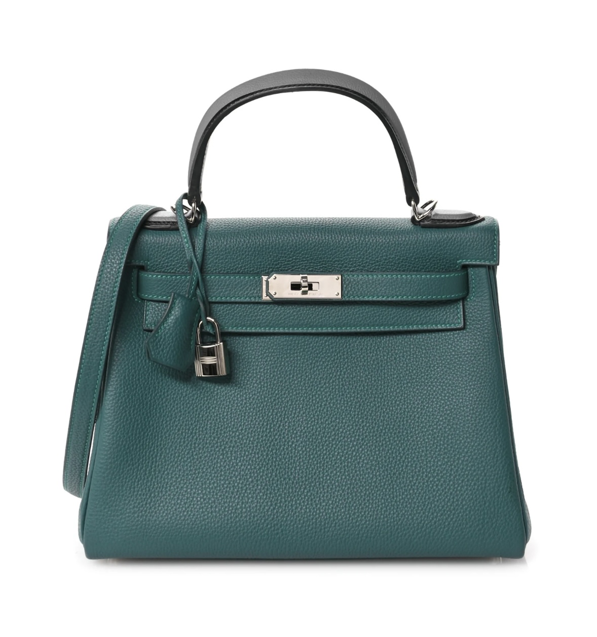 • Material: Premium Togo calfskin leather with natural pebble grain, contrasting black leather top handle, detachable adjustable Malachite Turquoise leather shoulder strap, polished silver-tone metal hardware